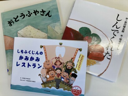 子どもたちが食べ物に興味を持てるように、メルヘン館(図書室)には食べ物に関する絵本をたくさん置いています。