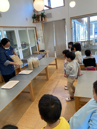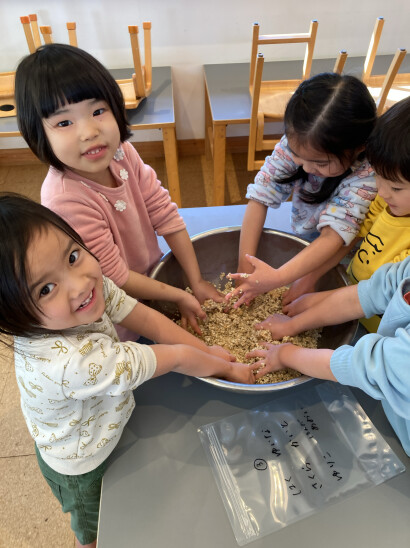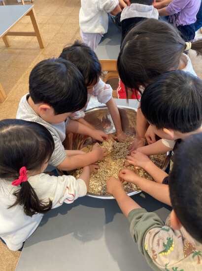 味噌は何の豆から出来るのかをクイズにしたり、みそ麹を実際に子どもたちが手で混ぜて、味噌を作りました。1週間ごとに味噌を観察し、1年間発酵させて、給食の料理に使用します。自分たちで作った味噌が給食に出てくることを楽しみにしているようです。