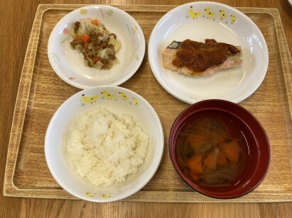 ◎鮭のチーズ焼き ◎キャベツの納豆和え ◎人参と玉葱のすまし汁