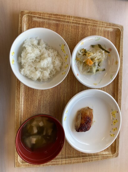 ◎鶏肉の照り焼き ◎春雨の酢の物 ◎豆腐とえのきの味噌汁
