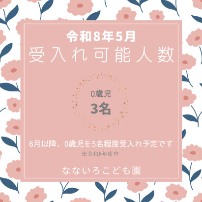 令和8年度中に0歳児を残り5名程度、6月以降順次受入れる予定です。
