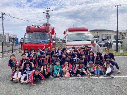 あか組(5歳児)が幼年消防クラブの結成式に参加しました。消防クラブの一員としてどんな役割があるのか消防士さんの話を聞き、法被を着て記念撮影も行いました。今日は初仕事として、みんなの前に立ち「おかしも」の約束を言ってくれましたよ!