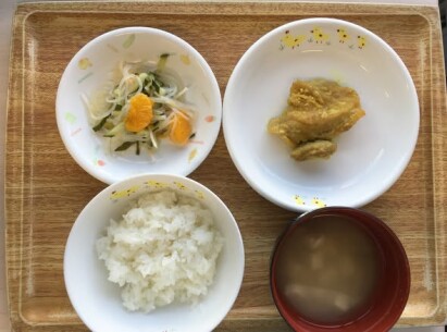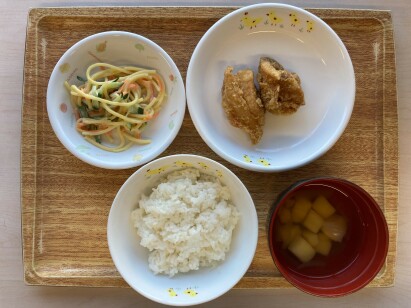 ◎鶏肉の唐揚げ ◎スパゲティサラダ ◎じゃがいものスープ