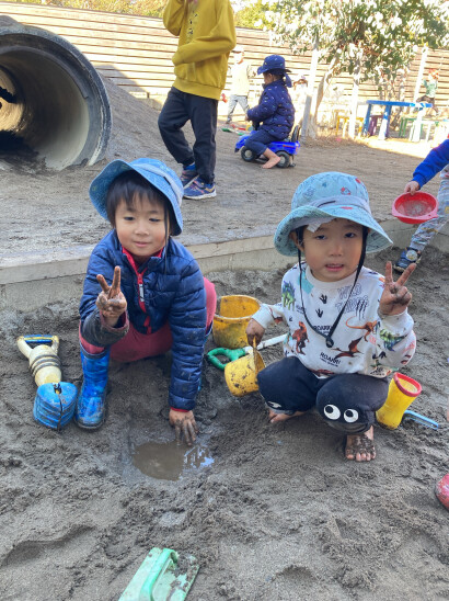 スコップやバケツを使ってままごと遊びをしたり、顔や服に泥がついても気にせず、思う存分水たまりを堪能しました!