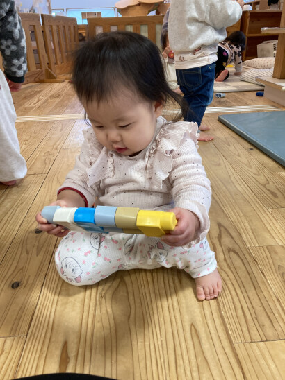ブロックを重ねて外してを繰り返して手指の運動機能を育んでいます。