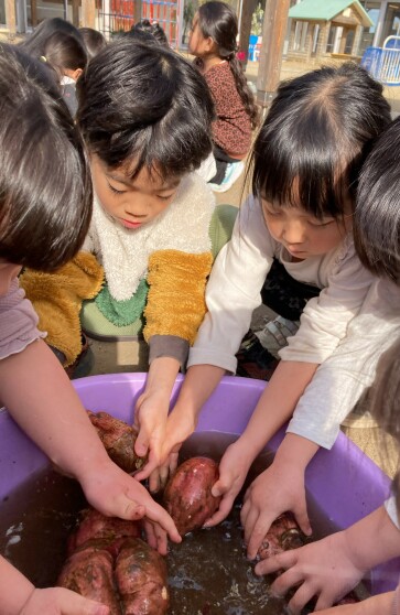 なないろ畑で育てたさつまいもが立派に成長したので、さつまいもをきれいに洗いました。