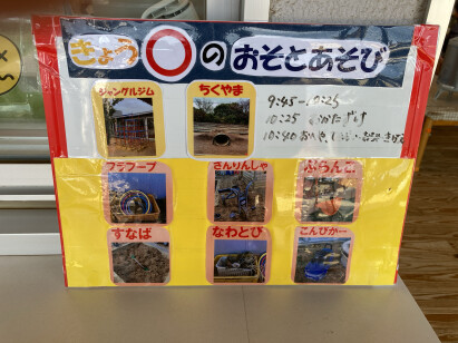 外遊びで子どもたちが安全に過ごすことができるように「そとあそびボード」を作りました。保育者の人数や子どもたちの人数・様子に合わせて遊ぶことができる遊具を設定しています。また、高さがある遊具は保育者が近くに付くようにして事故防止に努めています。