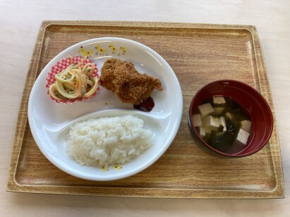 ◎チキンカツ ◎スパゲティサラダ ◎豆腐とわかめの味噌汁