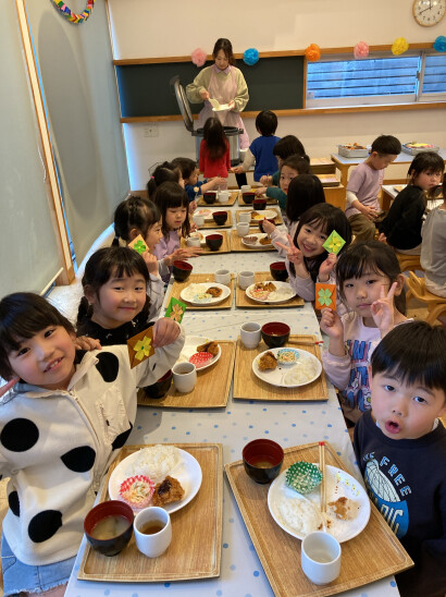 今週の給食は、セレクトメニューです。卒園児からリクエストあったメニューから栄養バランスを考えて、提供しています。人気のメニューで嬉しそうに食べる姿が見られましたよ!