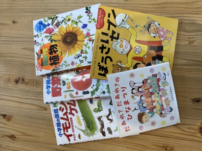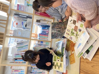 メルヘン館には、物語の絵本だけでなく、図鑑や行事にまつわる絵本も揃えてあります。子どもたちは、図鑑を広げて植物や虫の種類や名前を調べたり、職員は、季節に合わせて行事の絵本を活用したりして、日々の保育に役立てています。