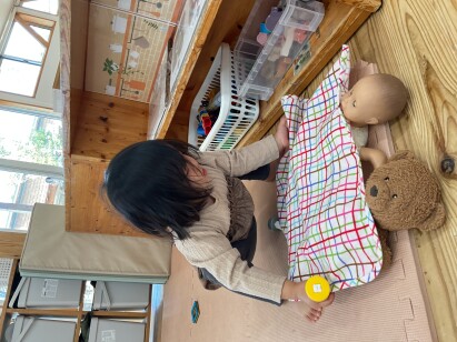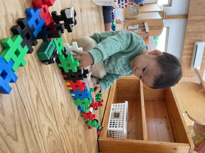 最近はニューブロックを使って遊ぶ姿が多く見られます。車やアイスを作り走らせたり食べさせたりと遊びを通して、想像力や表現力を育てています。最近はニューブロックを使って遊ぶ姿が多く見られます。