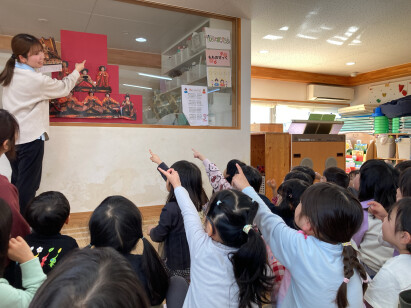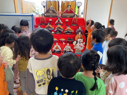 今日はひなまつりですね。絵本やイラストを用いてひなまつりの由来や雛人形についてお話をしました。その後、興味津々に雛人形を見ていましたよ。