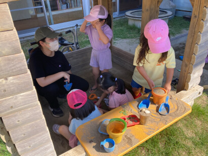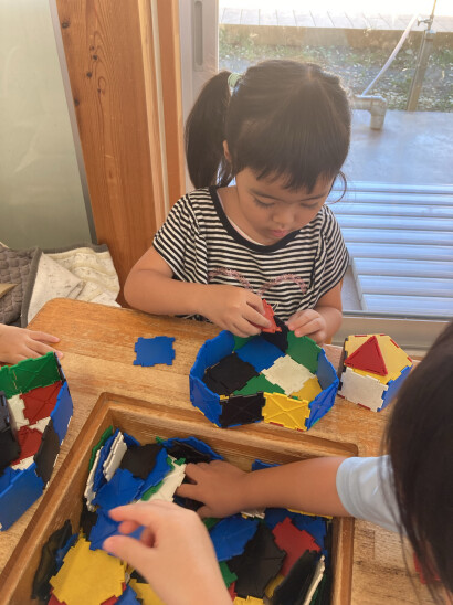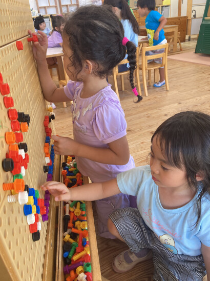 3歳以上児になると、手先を使ったり自分達でイメージを膨らませて作ることが出来るような玩具を選び設置しています。形がないものだからこそ、子どもたちの集中力も伸ばせています。