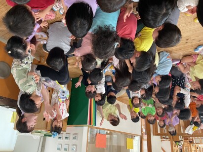 まだ、言葉がわからなくても、保育者の声に耳を傾けたり、繰り返しの言葉のリズムを楽しんでおり、子どもたちにとっても大好きな時間となっています。読み聞かせを通して、一人ひとりの表情や反応を大切にしながら、安心感や信頼感を育んでいます。