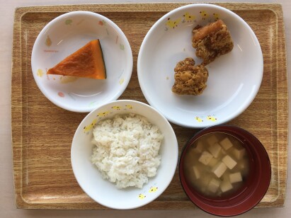 ◎レバーの唐揚げ ◎もやしと青菜のナムル ◎かぼちゃ中華スープ