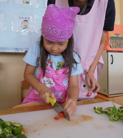 緊張しながら真剣な面持ちで包丁を握っています!(^^)!
