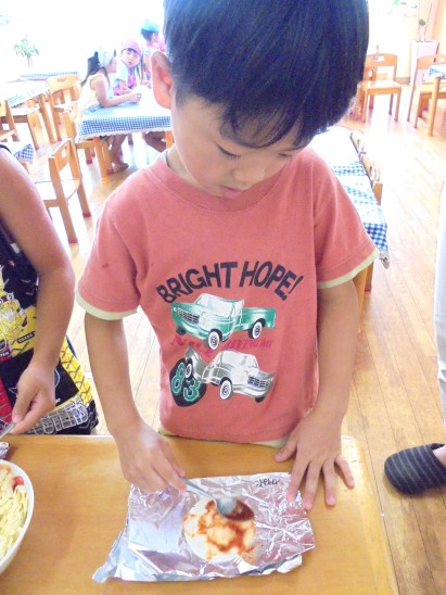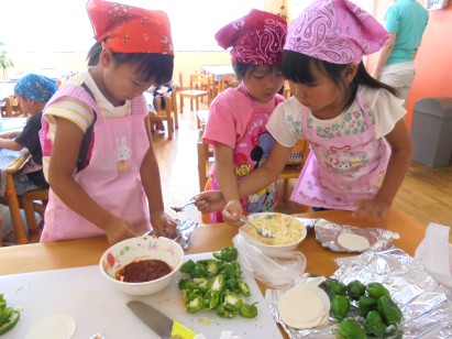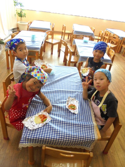 自分たちでトマト・ピーマン・チーズを好きなようにトッピングしました♪
