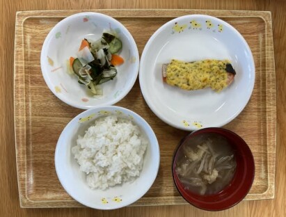 ◎鮭のマヨネーズ焼き ◎キャベツの甘酢和え ◎もやしとあげの味噌汁