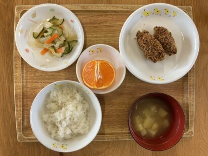 ◎魚ろっけ ◎キャベツの中華和え ◎みかん ◎じゃが芋の味噌汁
