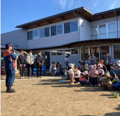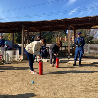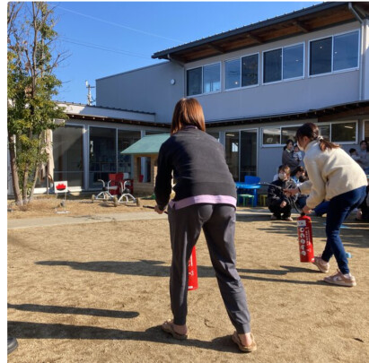 今回は火災による訓練で、実際に消防士の方に来てもらい、職員も消化器の使い方や、火災の時の初期消火の仕方を教えて頂きました。このように、日頃から防災意識を持ち、万が一の時にも子どもたちの安全を守れるよう取り組んでいます。