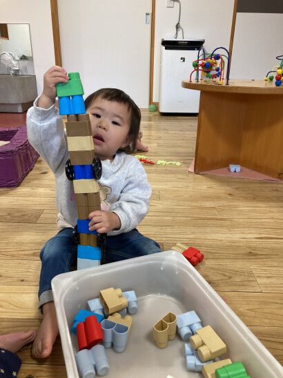 ブロックを重ねて外してを繰り返して手指の運動機能を育んでいます。