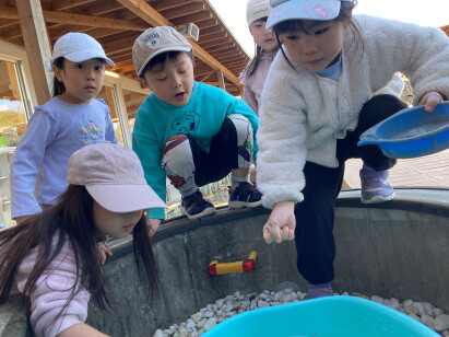 気温が低い日の園庭では、水溜りやメダカの水槽に氷が張っています。