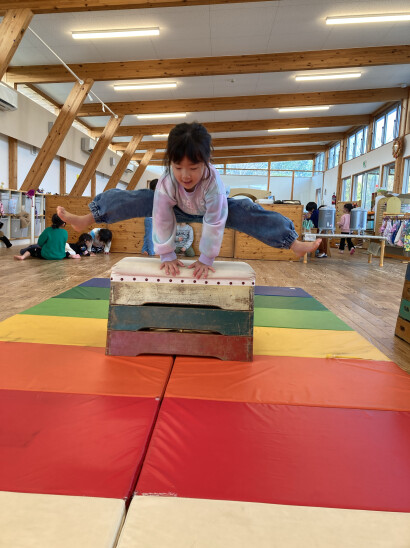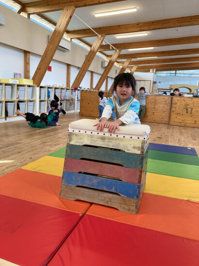 2月に行われる跳び箱大会に向けて、跳び箱遊びを取り入れていますよ。