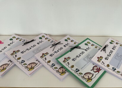 子どもたちがこれまで取り組んできた製作や絵をまとめた「せいちょうのきろく」を展示しています。