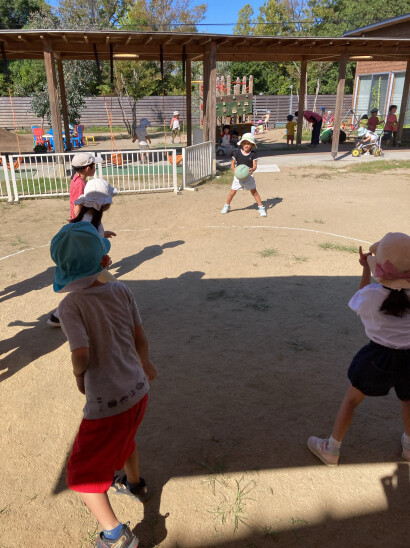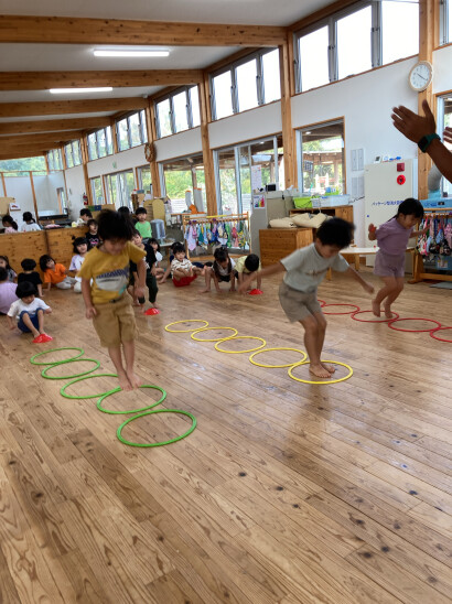 毎週木曜日には、年中児と年長児が楽しみにしている体育教室があります。様々な動きを通して運動機能を高めたり、協働性などが育まれていきます。体育教室の最後には毎回ゲームを行い、その中でも人気の爆弾ゲーム(中当て)では普段でも子どもたちが自分でルールを決めながら遊んでいますよ。