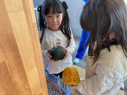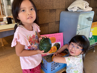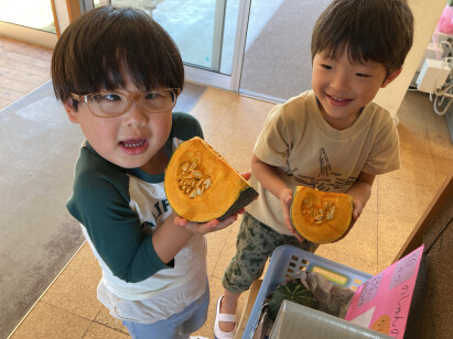 毎月一回、ランチルーム入口に旬の野菜展示を行っています。10月の南瓜は、園庭で採れた「南瓜」が展示してあり、より親しみをもって野菜に触れている様子がありました。