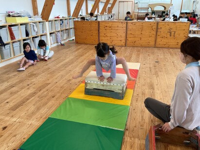 運動大会はフラフープ、跳び箱、鉄棒、なわとびの中から子どもたちが挑戦したい項目を選んでいます。一生懸命チャレンジして5回できると大会出場権を獲得し、スタンプを押してもらえるので喜んでいます。