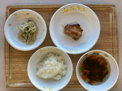 ◎鶏肉の味噌漬け焼き ◎もやしときゅうりの甘酢和え ◎わかめスープ