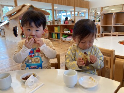 3歳以上児クラスでは、昼食やおやつを決まった時間内であれば好きな時に食べることが出来ますよ。仲の良いお友だちと一緒に来て「おいしいね」「見てて、お野菜食べれるよ!」と会話をしながら楽しく食べています♪