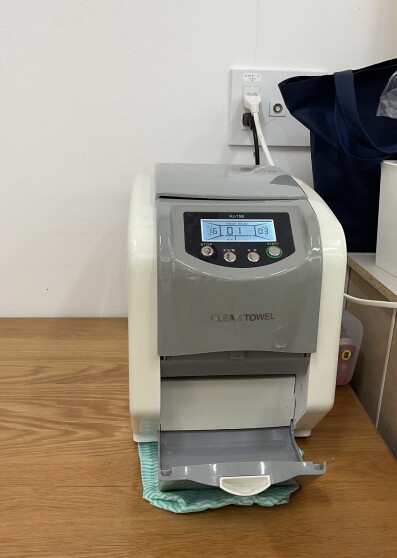 口に含んでも大丈夫な消毒液を使用し、専用の機械で必要な分だけ準備しているのでいつも清潔なおしぼりを使うことができます。