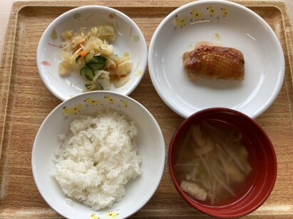 ◎鶏肉の味噌漬け焼き ◎キャベツのじゃこ和え ◎もやしの味噌汁
