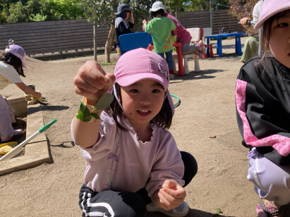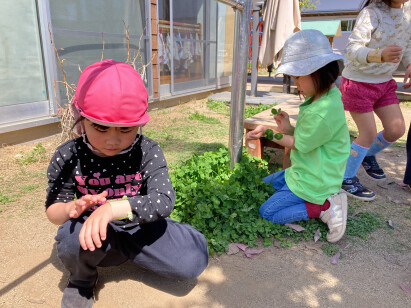 新緑や花などの自然の色や「この小さいピンクの花はなんていうんだろう?」「タンポポのフワフワ(綿毛)が緑の中から出てきた!茶色い所は種だよ!」と興味や発見を楽しみました。