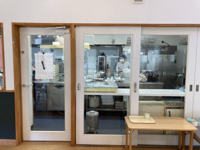 給食室はガラス張りになっていて、給食の先生や調理の様子が見えるようになっています。