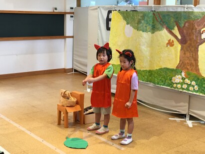 日頃から過ごしている園舎内での開催ですので、安心して本番を迎えることができ、少人数グループでの発表は、子どもたちが教え合ったり支え合ったりする姿や言葉かけも間近で見られ、今日の『劇』でも、お友だちに優しくセリフを教えている姿にホッコリしました。