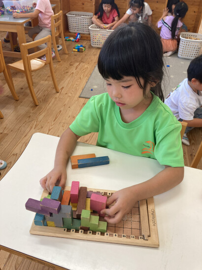 3歳以上児になると、手先を使ったり自分達でイメージを膨らませて作ることが出来るような玩具を選び設置しています。形がないものだからこそ、子どもたちの集中力も伸ばせています。