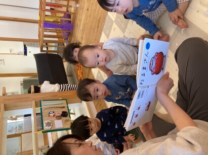 まだ、言葉がわからなくても、保育者の声に耳を傾けたり、繰り返しの言葉のリズムを楽しんでおり、子どもたちにとっても大好きな時間となっています。読み聞かせを通して、一人ひとりの表情や反応を大切にしながら、安心感や信頼感を育んでいます。