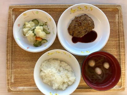 ◎ハンバーグ ◎キャベツサラダ ◎手まり麩のすまし汁