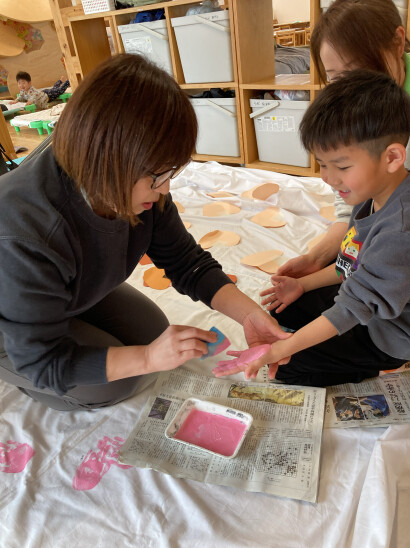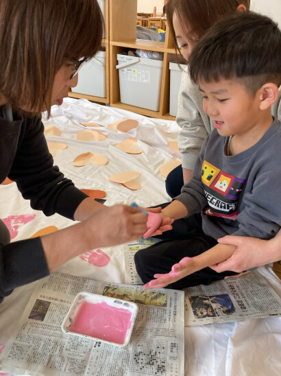 毎年、卒園式の壁面は卒園児の手形をとり、動物やマークを作り職員と子どもたちと一緒に心を込めて作っています。既製品ではなく、手作りの温かみを感じられ、アットホームな雰囲気で卒園式を行っています。