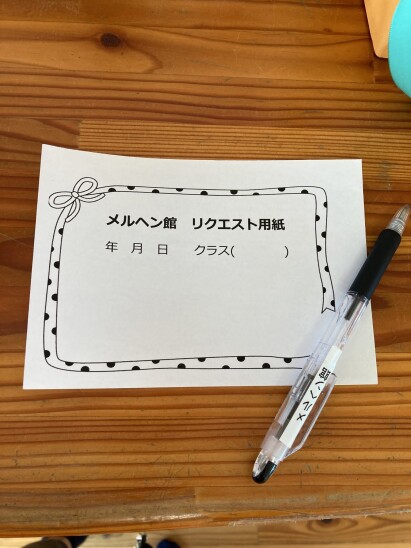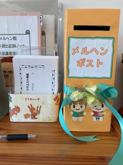 メルヘン館(貸し出し絵本コーナー)には、❝リクエストボックス❞を設置しています。「子どもが好きな絵本があったらな」「子どもに読んであげたい絵本があるんだけど…」という保護者の方から、絵本名を用紙に記入してリクエストボックスに入れていただきます。リクエストのあった絵本は、出来る限り揃えるようにし、子どもたちが絵本に親しみやすい環境を心掛けています。