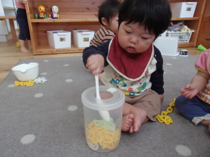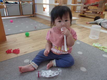 あお組のお友だちの中でレンゲが大人気!混ぜ混ぜしたり、あーんと食べさせてくれたりにぎにぎするだけでも楽しいおもちゃです♪