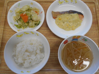◎鰆の米粉ムニエル ◎マカロニサラダ ◎豆腐とキャベツの味噌汁