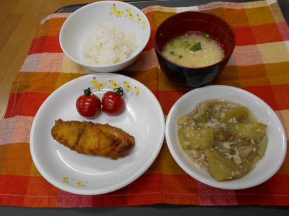 今日の献立 ◎魚の香味揚げ ◎茄子のそぼろ煮 ◎かきたま汁