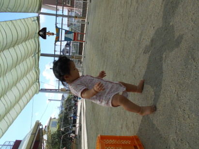 今日も気温が高く、時間を決めて少しだけ園庭へ出ると自分の影に気づいて釘付けになる姿が…。