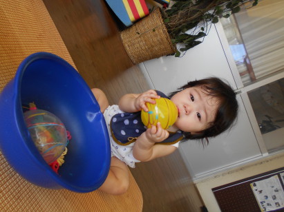 月齢の小さな子供たちはテラスでヨーヨーの感触に興味津々で触れたり口元で感触を確かめていましたよ!