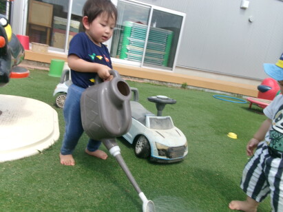 外遊びの中で、以上児クラスのお友だちの真似をして高い所に登ろうとする1~2歳児さんもいます。